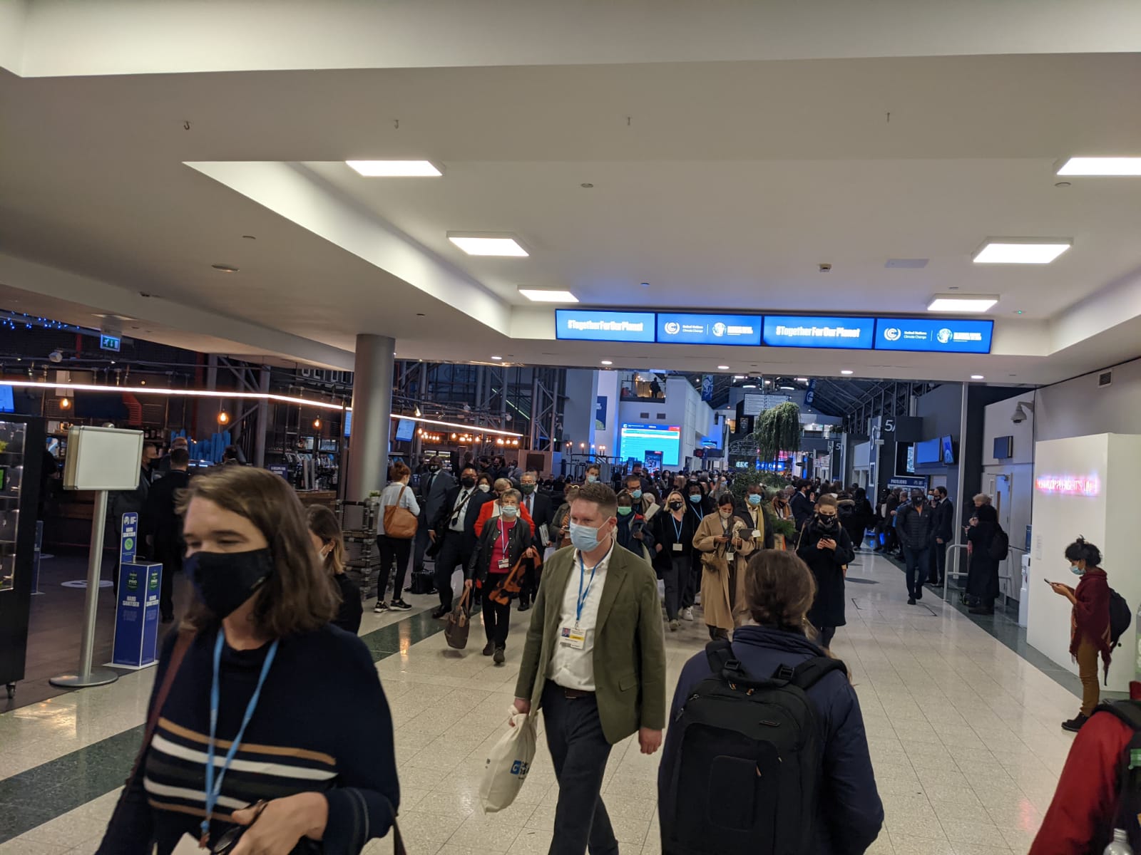 My first impression of the Blue Zone in COP is – disorienting really. Arriving just after 3pm having finished my presentations at St Aloysius’ College the queues which covered Twitter on the opening days of COP were non-existent. Having my Covid tests ready, along with letters and ID I passed through two rounds of security before getting to the registration desk. Commenting on the particularly terrible photo the kind lady assured me confidently that no-one gets away lightly. Armed with my blue lanyard and my terrible photo I was ready to take on the Blue Zone.