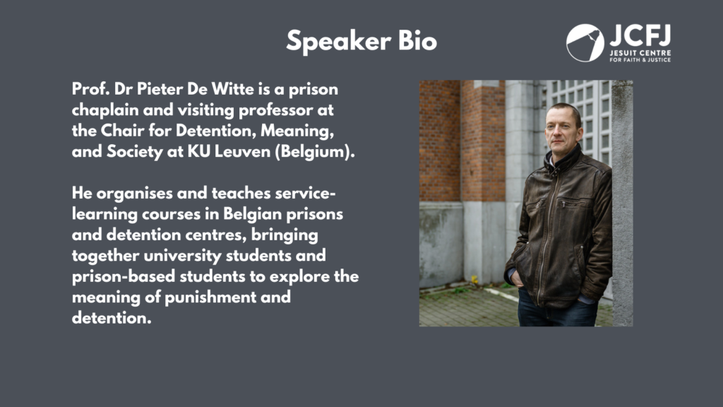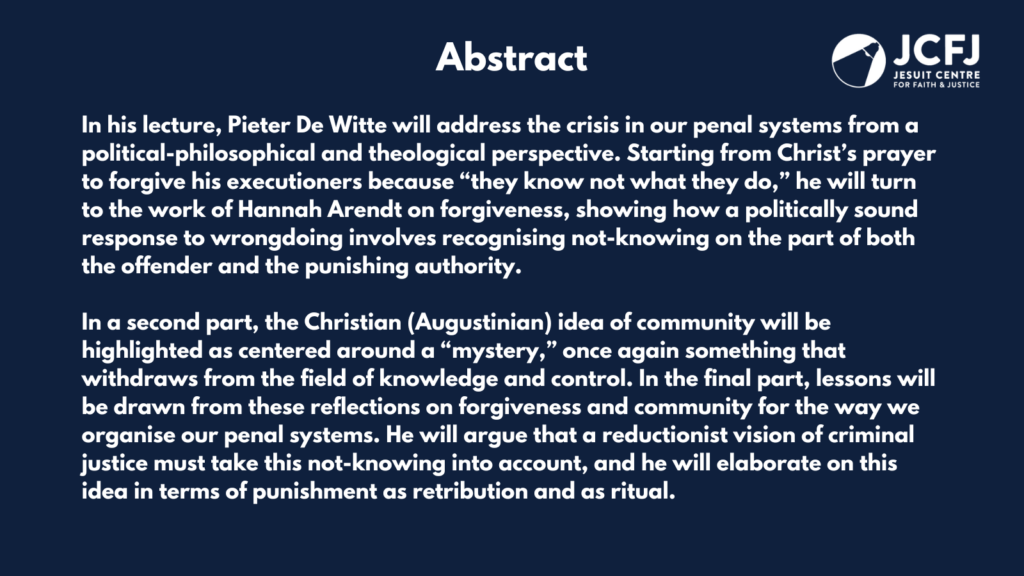 This year’s paper, “For we know not what we do. Reflections on punishment, community and forgiveness,” will be delivered by Prof. Dr. Pieter De Witte, KU Leuven on Tuesday, 21st April.
