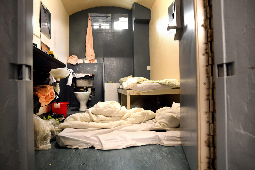 A cell in Mountjoy Prison with a mattress on the floor to accommodate a second prisoner due to overcrowding.